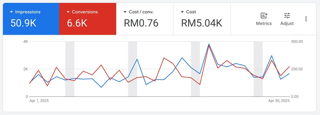 In just one month (April 1–30, 2025), our Google Ads campaign delivered 50.9K impressions and 6.6K conversions with a total spend of RM5,040, achieving an impressive cost per conversion of only RM0.76.