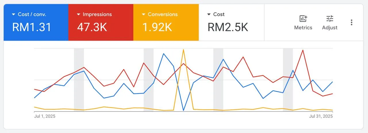 In just one month (July 1–31, 2025), our Google Ads campaign achieved 47.3K impressions and 1.92K conversions with a total spend of RM2,500, resulting in a cost per conversion of only RM1.31.